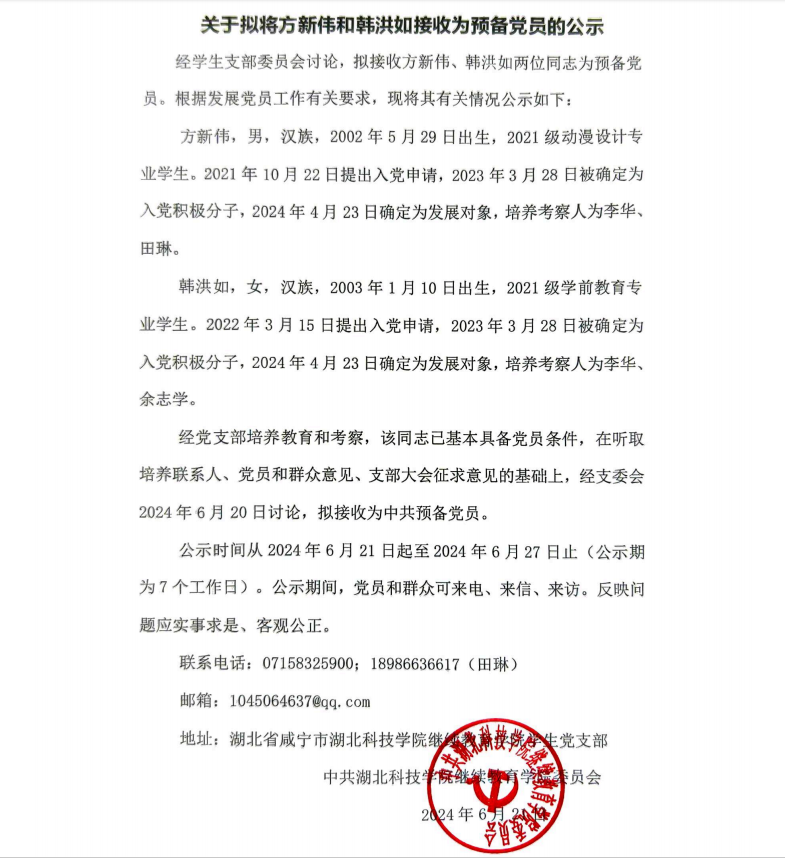 milan米兰官网学生支部关于拟将方新伟和韩洪如接收为预备党员的公示
