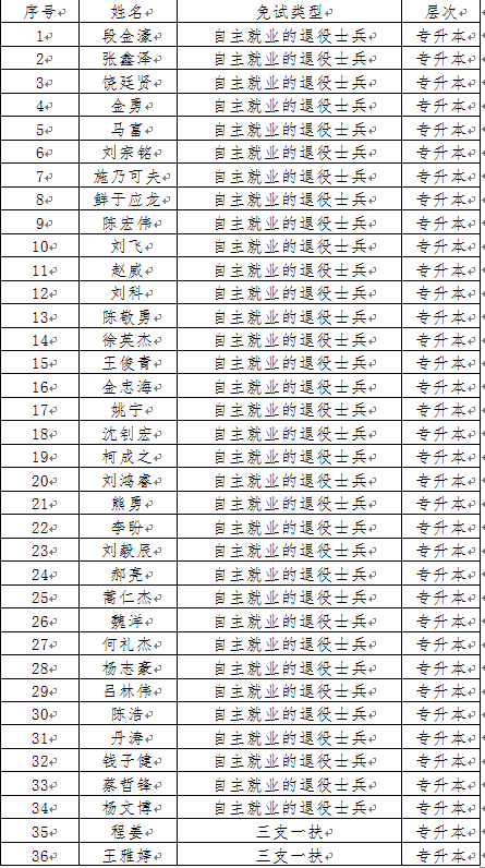 根据教育部和湖北省关于高校成人教育招生考试免试条件的有关文件规定和要求,退役军人免试条件是专科毕业且自主就业或者自主择业的考生,“三支一扶”条件是普通专科毕业且有“三支一扶”证明的考生。今年报考米兰官网的免试生有两种类型:退役军人和三支一扶考生。经米兰官网对考生材料初步审核,36名考生符合免试条件。现公示如下: